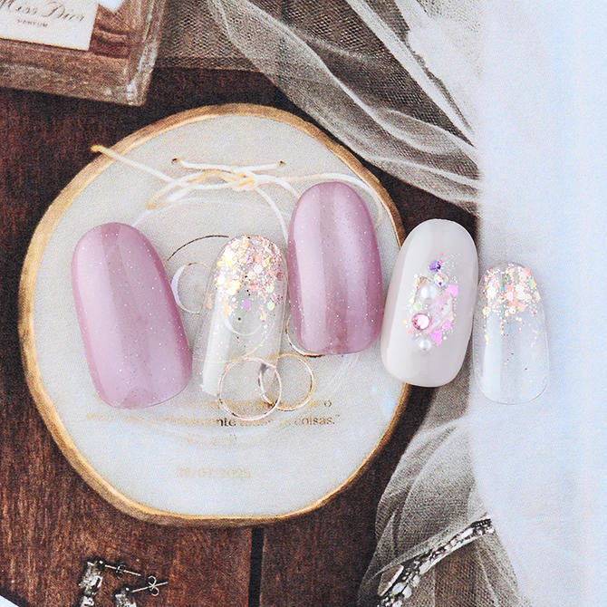 ピンクの薔薇と薬指のパールで作ったハートがポイント。